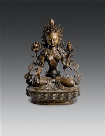 清代佛像臉型方圓豐潤,豐頤寬額,大耳垂肩,白毫凸起,五官精致,雙目傳神。身體比例協(xié)調,造型優(yōu)美。多著漢式衣服,衣紋呈放射狀,衣褶曲折生動,帔帛較為寬大。胸前所飾的瓔珞、串珠雕刻得極為精美細膩。蓮座底沿明顯外撇,蓮瓣規(guī)整,扁平,一般只圍大半,度母眼線為一波三折式,間距較寬,冠葉呈平板狀,不鏤空。