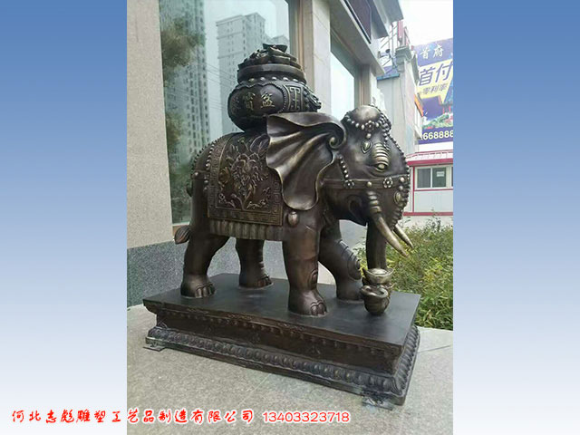銅大象是動(dòng)物雕塑中常見(jiàn)的雕塑,這件銅雕在傳統(tǒng)銅大象動(dòng)物雕塑的設(shè)計(jì)上增加了背上的聚寶盆。