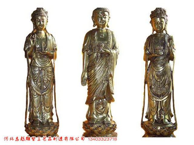 西方三圣像是佛像中的重要佛像雕塑。中央主尊為阿彌陀佛,左為觀世音菩薩,右為大勢至菩薩,合稱"西方三圣"。志彪銅雕廠提供訂做,歡迎聯(lián)系我們進(jìn)行洽談,網(wǎng)上展示圖片僅供參考,詳細(xì)資料和作品信息請聯(lián)系我們索取。