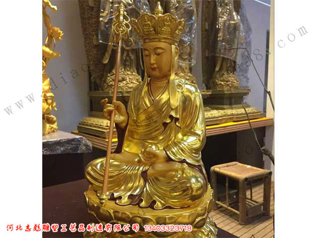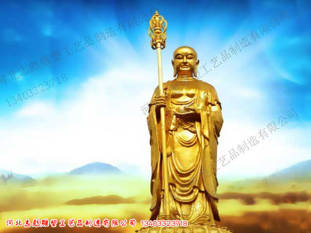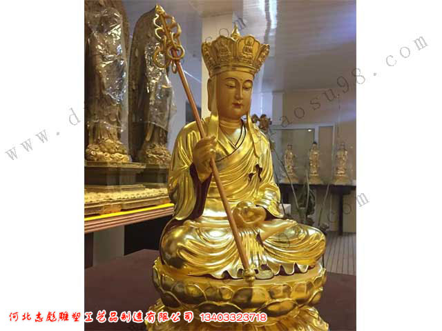 地藏王菩薩鎏金雕塑,全身金光燦燦,光彩奪目,普度眾生像非常值得人們尊敬和敬仰。河北志彪銅雕工藝品廠定做電話:0312-4981632